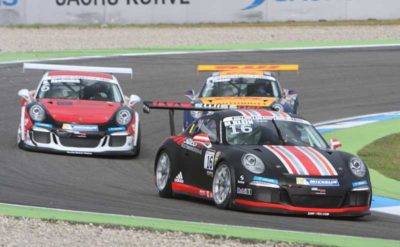 Earl Bamber holt den ersten neuseeländischen Sieg im Porsche Carrera Cup Sven Müller bester Rookie im Feld Vom 02. bis 04. Mai startet der Porsche Carrera Cup im Rahmen der DTM im Badischen auf dem Hockenheimring in die Saison 2014 mit einem neuen Porsche 911 GT3. Am Samstag wird der Porsche Carrera Cup seinen 50. Lauf auf dem Hockenheimring absolvieren. Insgesamt gehen 37 Teilnehmer in 16 Teams aus zwölf Nationen hier an den Start. Mit vierzehn Piloten ist Deutschland die stärkste Nation. Aus Österreich kommen fünf Fahrer; die Schweiz und die Niederlande stellen je vier Piloten. Aus den Vereinigten Staaten und Dänemark kommen zwei Lenkradvirtuosen, während Neuseeland, Finnland, Polen, Schweden, Frankreich und Spanien je einen Kutscher schicken. Zwölf Piloten von ihnen bestreiten zum allerersten Mal ein Rennen im Porsche Carrera Cup. Mike Halder mit 18 Jahren ist der Jüngste im Feld. Hingegen ist Daniel Allemann mit seinen 55 Lenzen der Älteste. In diesem Jahr werden sich sieben Fahrer um die Rookiewertung streiten. Nach einem Jahr der "frauenlosen Zeit" wird wieder eine Rennamazone ins Lenkrad greifen und zwar Michelle Gatting. ![]() 37 Fahrerinnen und Fahrer nahmen am Freitagnachmittag ihr freies Training, welches über eine Stunde ging bei trockenem Wetter unter die Räder. Zunächst wechselten die Positionen des öfteren. Am Ende hatte sich der US-Amerikaner Connor de Phillippi (Förch Racing by Lukas Motorsport) mit 22 Runden und einer Zeit von 1:43,131 Minuten in Szene gesetzt, gefolgt von dem Neuseeländer Eari Bamber (Team 75 Bernhard) und einem weiteren US-Amerikaner Sean Johnston (Team Deutsche Post). Der beste Fahrer der B-Wertung war Rolf Ineichen (Konrad Motorsport) auf Platz zwanzig. Die einzige Dame im Feld Michelle Gatting (Attempto Racing powered by Häring) nahm Platz 24ig ein. Christian Engelhart (Konrad Motorsport) und Nicki Thiim (QPOD Walter Lechner Racing), die beiden Piloten, die vor einer Woche in der ADAC GT Masters unterwegs waren, hatten sich auf den Rängen sechs und 19 platziert. Der beste Rookie war Sven Müller (Team Deutsche Post) auf Rang dreizehn. ![]() Am Samstagmittag von 13.00 Uhr bis 13.35 Uhr wurde es ernst für die Fahrerinnen und Fahrer, denn nun mussten sie ihre Startpositionen für das samstägige und sonntägige Rennen ausfahren. Zwanzig Minuten lang werden alle Protagonisten auf der Strecke sein. Sie müssen nun versuchen unter die besten 15 zu fahren. Diese haben dann noch einmal zehn Minuten um dann ihre endgültige Startposition auszufahren. Bei noch elf Minuten zu fahrender Zeit hatte sich Philipp Eng (Team Deutsche Post) an die Spitze gefahren mit einer Zeit von 1:42,193 Minuten, gefolgt von Jim Pla (TECE MRS-Racing) und Christopher Zöchling (Konrad Motorsport). Unterdessen hatte sich Ralf Bohn (Team GT3 Kasko) auf der Strecke gedreht. Wenig später landete Wolf Nathan im Reifenstapel. Michelle Gatting hatte sich noch nicht unter die besten 15 geschoben. Christian Engelhart belegte Rang fünf. Nicki Thiim lag nur auf Platz 36. Bei noch viereinhalb Minuten zu fahrender Zeit hatte man das Fahrzeug von Wolf Nathan geborgen und die Pilotinnen und Piloten hatten wieder freie Fahrt. ![]() In der letzten Minute hatte sich Nicki Thiim bis auf Platz elf nach vorne geschoben. Nachdem die Zeit abgelaufen war, konnte niemand an die Zeit von Philipp Eng mit 1:42,039 herankommen. Ihm spielte der Ausrutscher von Wolf Nathan in die Hände, denn es wurde bis zur Bergung des Fahrzeugs sehr lange gelb geschwenkt. Platz zwei und drei nahmen Alex Riberas (Attempto Racing powered by Häring) und Sven Müller ein. Christian Engelhart und Nicki Thiim lagen auf den Plätzen sechs und zehn. Nach einer kurzen Pause ging für die 15 Schnellsten die ganze Sache von vorne los. Nach drei gefahrenen Runden hatte sich Connor de Phillippi mit einer Zeit von 1:41,786 Minuten an die Spitze gefahren, gefolgt von Philipp Eng und Nicki Thiim. Christian Engelhart befand sich auf Rang zehn. In der letzten Minute sprang Nicki Thiim auf Rang zwei. Unterdessen hatte der Führende seine eigene Bestzeit nochmals unterboten. Er setzte für alle anderen eine Zeit von 1:41,388 Minuten. Nach fünf Runden hatte sich Connor de Phillippi mit 1:41,388 Minuten auf Rang eins gefahren. Hinter ihm platzierten sich Nicki Thiim und Christian Engelhart. Sven Müller war mit Rang fünf der beste Rookie im Feld. ![]() Ihren ersten Lauf in dieser Saison nahmen die Pilotinnen und Piloten am späten Samstagnachmitag in Angriff. Nach der Einführungsrunde funktionierte der Start ohne weiteres und der Pole-Setter Philipp Eng konnte seine Position behaupten und führte das Feld in die erste Kurve. Hingegen hatte Jim Pla auf Platz zwei einen sehr schlechten Start mit durchdrehenden Reifen. Überall im Feld wurden harte aber faire Zweikämpfe ausgetragen. In der Spitzkehre kamen sie mit einigen leichten Touchierungen hindurch. Aus dem hinteren Feld hatte sich Pieter Schothorst in der Sachskurve ins Kiesbett rausgedreht. Nach der ersten Runde führte weiterhin Philipp Eng mit einem Vorsprung von 1,6 Sekunden, gefolgt von Nicki Thiim und Jim Pla. Unterdessen waren Robert Renauer und Antti Buri in die Box gekommen. Ola Nilsson drehte sich in der Mercedes Arena. Im Verlauf der zweiten Runde hatte sich Michelle Gatting auf der Strecke gedreht. Zu diesem Zeitpunkt war auch Elia Erhart mit technischen Problemen zur Box gekommen. ![]() Jim Pla hatte alle Hände voll zu tun sich fünf Fahrzeuge vom Hals zu halten. Er musste absolute Kampflinie fahren. Auf Rang neun hatte Sean Johnston sechs Fahrzeuge im Nacken sitzen. In der Spitzkehre berührten sich Earl Bamer leicht und Jim Pla kam weit raus und verlor dann gleich zwei Plätze. Rang drei und vier nahmen nun Earl Bamber und Christopher Zöchling ein. Nun musste sich Jim Pla harten Attacken von Connor de Phillippi erwehren. Christian Engelhart und Alex Riberas lauerten nur auf einen Fehler dieser beiden um dann gleich vorbeiziehen zu können. Zu dieser 